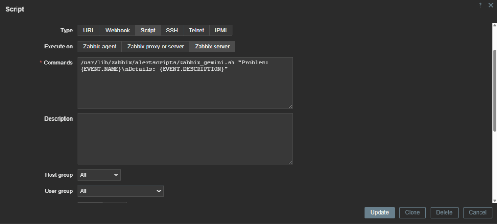 /usr/lib/zabbix/alertscripts/zabbix_gemini.sh "Problem: {EVENT.NAME}\nDetails: {EVENT.DESCRIPTION}"